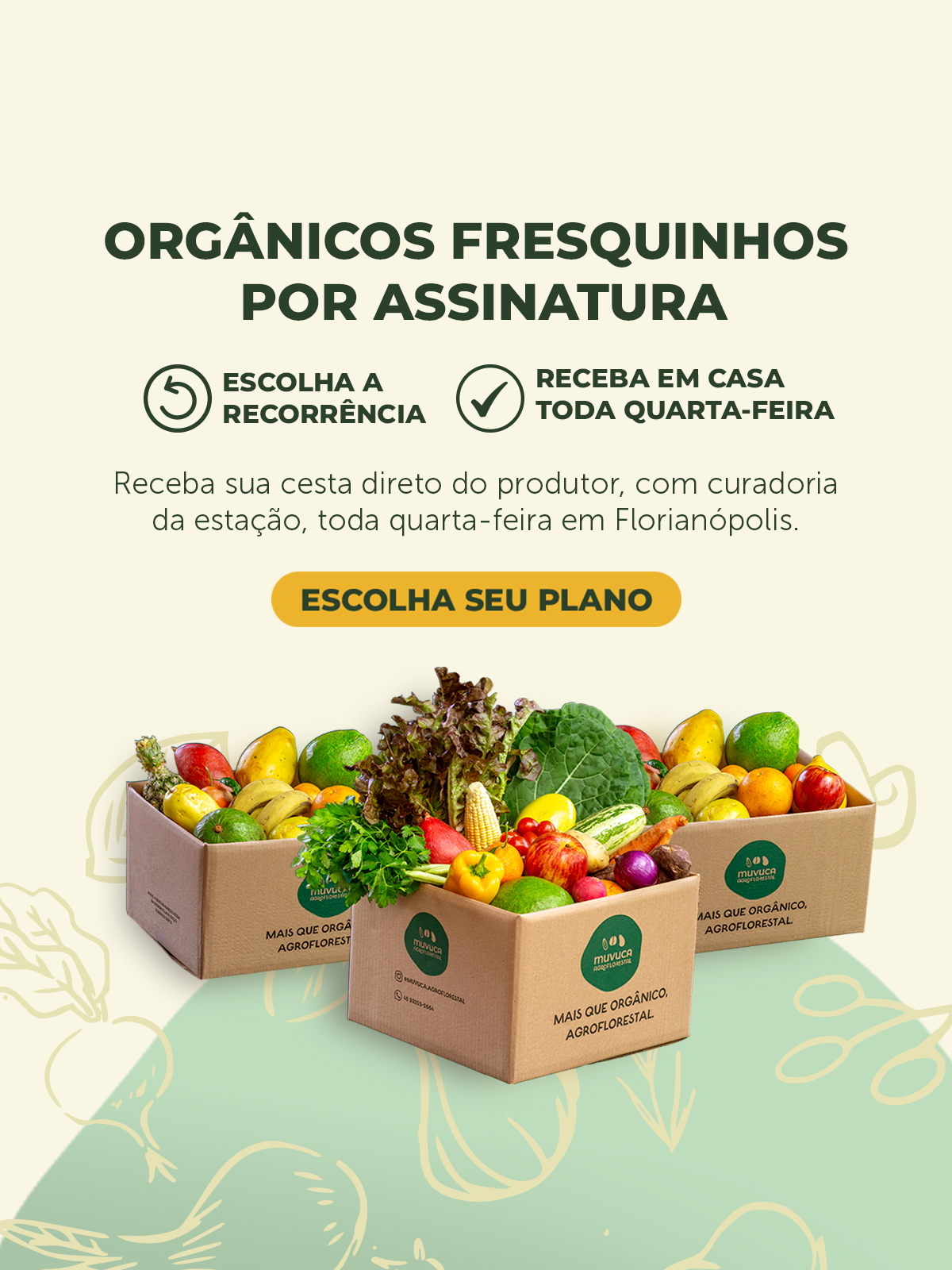 Receba toda quarta-feita na sua casa sua cesta orgânica e seus produtos saudáveis.