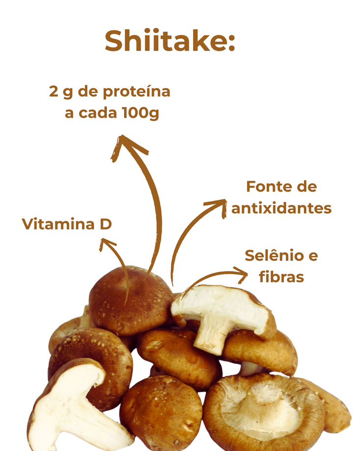 De sabor marcante e textura carnuda, o Shiitake é um dos cogumelos mais consumidos do mundo. Combina com risotos, refogados e pratos orientais.